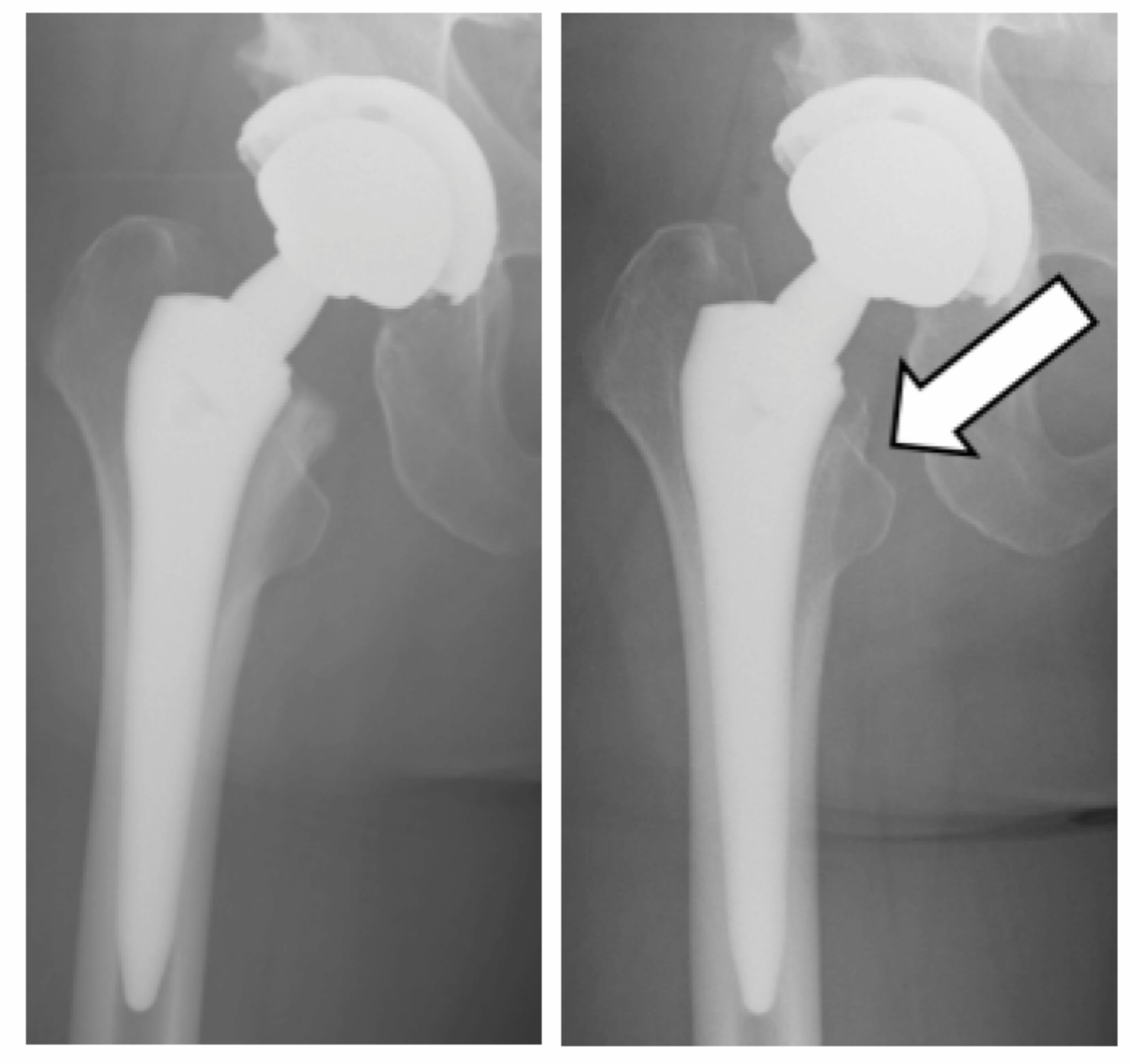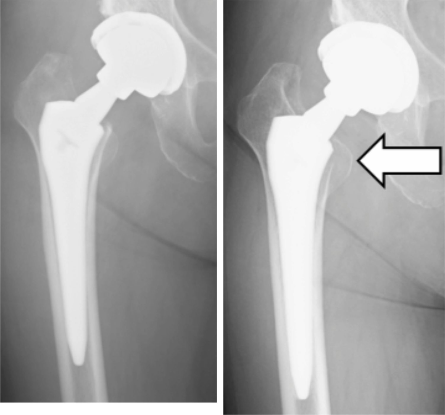 Figure 1: Immediate postoperative antero posterior radiograph of the hip at primary THA (A) and 2 years after surgery (B) showing calcar resorption (arrow)