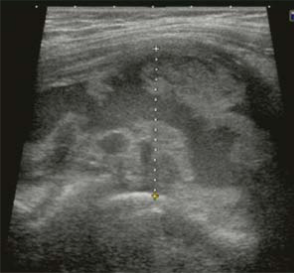 Figure 2 :Ultrasound scan, lateral to anterior, of the hip in Case 1, demonstrating a mixed fluid and solid mass.