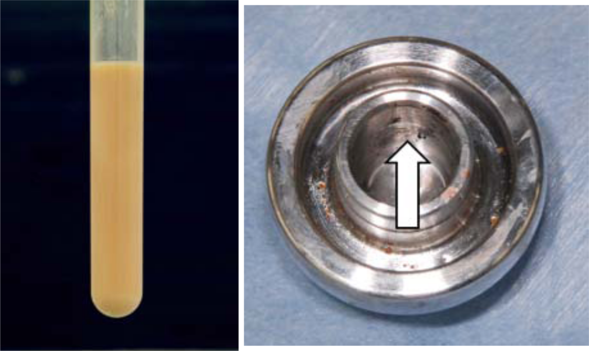 Diagnosed as ARMD, she underwent revision surgery. A large amount of abnormal fluid, ranging from milky white to yellow in color (Figure 4), was encountered on incising the tensor iliotibial band through a posterolateral approach.