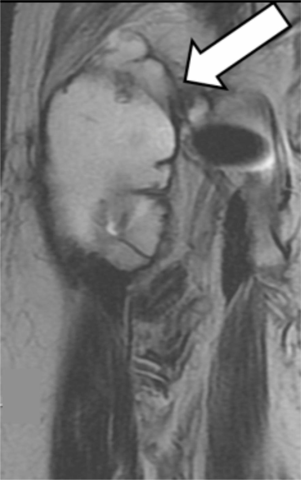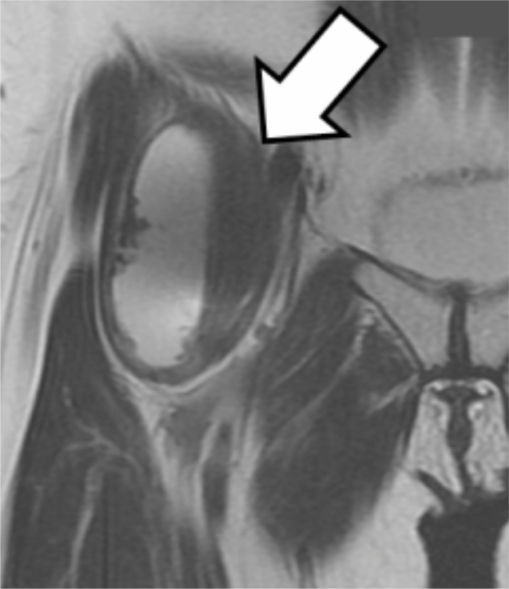 Figure 3: T2-weighted coronal MR image in Case 1 (Arrow: pseudotumor).