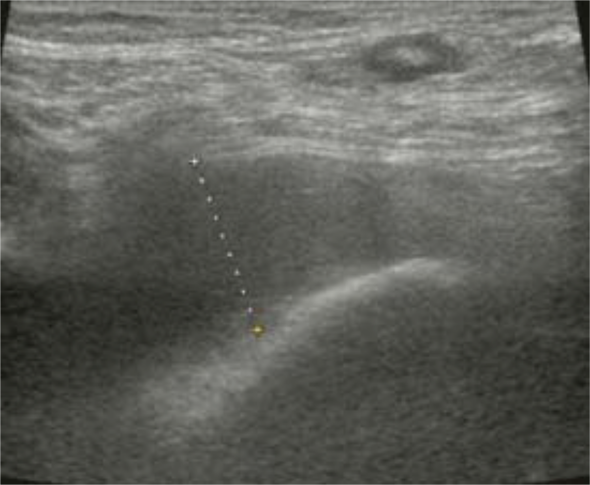 Figure 7: Ultrasound scan around the hip in Case 2 demonstrating a low echoic mass.