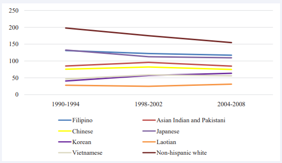 As shown in Figure 1, Filipinos have the highest IR among the Asian ethnic groups studied, second only to non-Hispanic whites followed by the Japanese. It is also noted that there is a decreasing trend in all of the groups studied save for the Koreans, which had slightly increasing numbers.