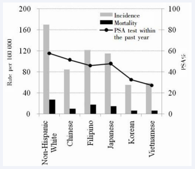 There is still limited local data on the prostate cancer antigen or prostate-specific antigen (PSA) screening rate in Filipinos residing within the Philippines, but data from the Philippine Urological Association website indicated that 2,066 and 4,348 men were screened in 2013 and 2014 respectively in their annual National Digital Rectal Examination (DRE) Day. Data was collected from 64 DRE screening centers nationwide [17]. However recent publications showed that, in Asian-Americans living in the United States, the screening rate in Filipinos (46.1%) is not too different from the Chinese (51.6%) and the Japanese (48%), which were slightly lower than in non-Hispanic white men (57.7%) [18]. The incidence and mortality of CaP in these Asian groups were one-half to three-fourths compared to that in non-Hispanic whites as shown in figure 2.