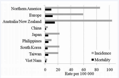 Figure 3: Age-standardized Incidence and Mortality of Prostate Cancer in Selected Countries. (Data were obtained from GLOBOCAN 2008. Incidence and mortality in all ages (0-75 years) were standardized using the world population. Reprinted with permission -Kimura, T. East meets West: ethnic differences in prostate cancer epidemiology between East Asians and Caucasians. Chin J Cancer; 2012[18].