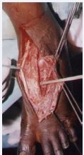 figure 2 The intraoperative assessment of the lesions showed a thread like artery and pedal vein containing blood clots.