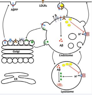 Maintaining an optimum acidic environment is critical for physiologically important functions of endolysosomes, and neurons are especially vulnerable to perturbations of endolysosome pH, because neurons are long-lived post-mitotic cells that possess an elaborate endolysosome system for quality control and because they are extraordinarily polarized cells with extensive processes that require endolysosomes for membrane trafficking to maintain physiologically important neuronal functions including neurotransmitter release, neurite outgrowth, and synaptic plasticity. As such, endolysosome dysfunction could lead to neurodegeneration [106-108]. Recently, altered endolysosome structure and function has been reported in HIVinfected brain [109-112]. More importantly and relevant to our perspective, it has been shown that Aβ is accumulated in neuronal endolysosomes in HIV-infected brain [8]. As mentioned earlier, endolysosomes are major sites where Aβ is produced from internalized AβPP [16-18]. The fate of endosome-derived Aβ is further influenced by the ability of Aβ degradation to be catalyzed by lysosome-resident cathepsins [23]. Thus endolysosome dysfunction can impair Aβ degradation in lysosomes leading to intraneuronal accumulation of Aβ [26]. In support, we have shown the elevation of endolysosome pH is accompanied by increased Aβ accumulation in neuronal endolysosomes [34,81].