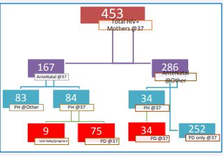 Figure 1 HIV Positive Mothers Attending Clinics from 2011-2015 (Reviewed records).Notes: ‘@37’ refers to attendance at 37 Military hospital, whereas’ @other ‘denotes attendance at other facilities. PH refers to Public health clinic, PD refers to Paediatric clinic, and AnteNatal refers to Antenatal clinic.” Enrolled patients” in the 3 red boxes (9+75+34 = 118), “Analysis patients” in 2 red boxes (75+34= 109)