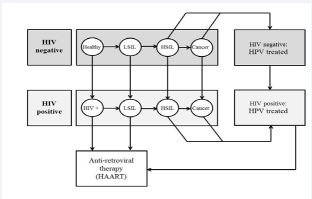 Where the dual vaccination strategy was being considered, healthy individuals could acquire HPV disease from a low grade intra-epithelial lesions [LSIL] to high grade intra-epithelial lesions, which has the potential to progress to cervical cancer. At each proposed HPV related health state, an individual may die [not represented graphically] or acquire HIV infection [which would see them progress on the lower ‘HIV positive’ spectrum of disease]. HIV positive, HPV infected individuals that were treated for HPV disease could potentially develop recurrent HPV disease. The model allowed for females with treated and untreated HPV disease to acquire HIV infection. There was a greater risk of transition to more serious HPV states among those HIV positive vs. those HIV negative. HIV positive individuals could potentially enter the HIV treatment pool. Every health state, irrespective of disease status, could progress to death at a rate determined by their current health state with consideration to the background mortality independent of their current health state. Mortality transitions were excluded from (Figure 1) as they rendered the model excessively ‘bushy’ and concealed the key message of the diagram. The arrows represented the transition probabilities from one state to another, with costs and utility measures then added to each health state to predict costs and QALYs over the 70 year duration of the intervention and the comparator. Once the HIV vaccine had been stopped, the HIV event rates were assumed lower in the HPV vaccinated individuals compared with the HPV unvaccinated individuals [61,62]. HPV vaccine protection was considered lifelong [80].
