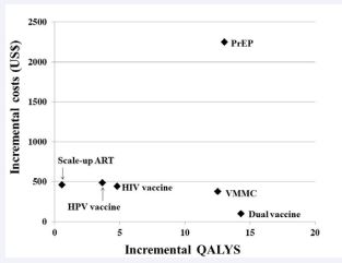 Methods: Adolescents attending South African schools in 2012 were included in the semi-Markov running annual cycles. The ART and HIV counseling and testing program [comparator] was weighed against the interventions [viz. HIV vaccine, a dual vaccine strategy [HIV and HPV vaccines], oral pre-exposure prophylaxis [PrEP] and voluntary medical male circumcision [VMMC]; and various combinations thereof. Quality-adjusted life years [QALY] determined changes in HIV associated mortality and infections averted. One-way and probabilistic sensitivity analysis determined parameter uncertainty. Discount rates of 3% with a lifetime horizon [70 years] were applied.