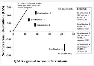 Global advances in biomedical interventions in the last decade have forced clinicians and decision makers alike to strongly reconsider their HIV prevention packages. Observations from clinical trials investigating voluntary male medical circumcision [VMMC] [5-8] and oral pre-exposure prophylaxis [PrEP] [9-12] have demonstrated partial success in decreasing sexual transmission of HIV. The general consensus by several experts remain that a ‘multi-faceted combination prevention’ approach is critical to curbing the advancement of the epidemic [13-15]. Clinical trials involving combination interventions are rarely investigated due to financial, ethical and feasibility constraints; yet are crucial to our understanding of defining an optimal portfolio of prevention. In the South African context, we considered the cost-effectiveness of implementing PrEP, HIV and human papillomavirus [HPV] vaccinations and VMMC against scaling-up the current coverage of ART.