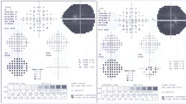 Figure 2: Visual field – campimetry (right and left eye): Reduced sensitivity of the fovea compared to the normal pattern. Total deviation shows adjacent points with diffuse reduction of sensitivity. Pattern deviation: such a intense reduction of sensitivity that shows no alterations. MD and PSD indices outside the normal limit tests with good reliability. Conclusion: the island of central vision in both eyes.