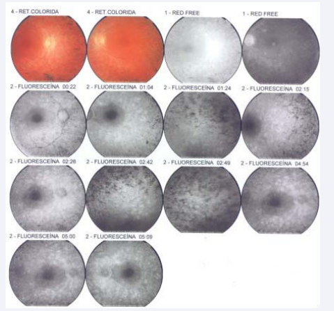 Figure 3: Monochromatic fundus (red free), followed by angiofluoresceina: hyper fluorescence background, default transmission RPE (window defect) and the corresponding areas hypo fluorescence pigmentary spicules.