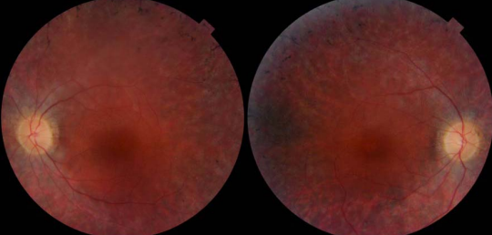 The patient reported onset with nyctalopia, evolving with decreased visual acuity and loss of peripheral field in both eyes (BE) a few years ago. Despite the optical prescription was hindering their daily activities. At baseline ocular examination showed visual acuity (VA) corrected 0,40 (BE) according to Snelling chart, with examination of dynamic refraction: right eye(RE) flat, -1, 00CD x 10° and left eye (LE) +1.25 SD -2.25 CDx 160°, and best corrected VA of 20/40 0,50 (+1) and 20/40 0,50 (+1), respectively. Ocular applanation tonometry: 16 mmHg (RE) and 13 mmHg (LE). Slit- Lamp Biomicroscopy showed no abnormalities Binocular indirect ophthalmoscopy, similar in BE: attached retina, mild temporal pallor of the optic disc, sparse spicules hyper pigmentation (resembling osteoclasts), and vascular attenuation.