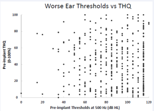 Figure 1: Pre implant hearing thresholds at 500 Hz in better ear versus THQ.