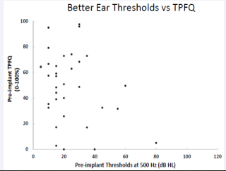 Figure 3: Pre implant hearing thresholds at 500 HZ in better ear versus TPFQ.