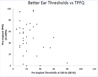 Figure 4: Pre implant hearing thresholds at 500 HZ in better ear versus TPFQ.