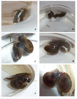 Figure 1 Mating behaviour sequences in Biomphalaria camerunensis and Biomphalaria pfeifferi. a: pursuance and mounting; b: circling; c: positioning; d: eversion of the preputium (the white arrow shows the male preputium searching for the female vaginal pore); e: probing (the white arrow shows the male preputium being inserted in the female vaginal pore); f: intromission (the white arrows indicates the preputium during insemination).