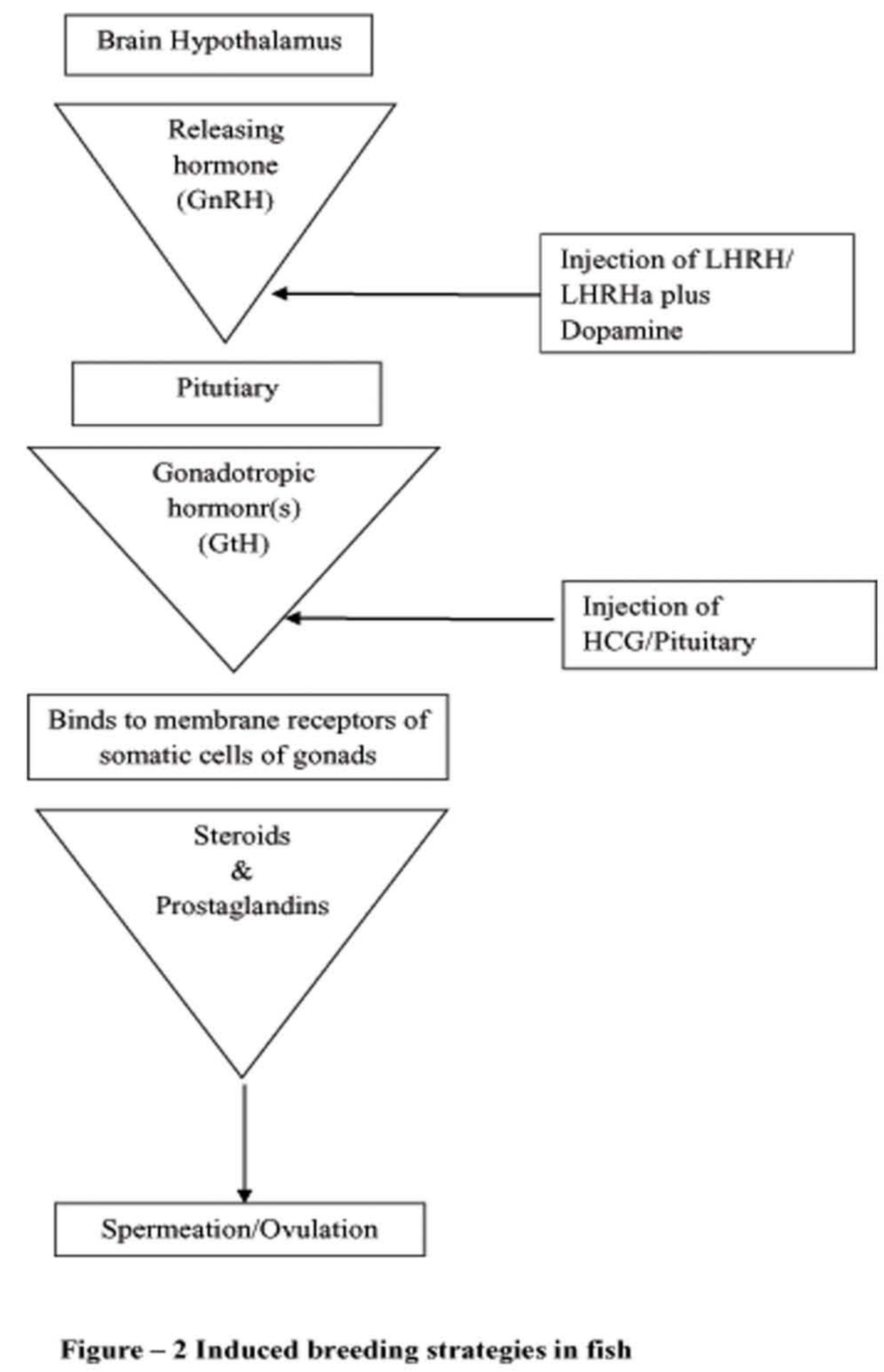 Fish reproduction is a periodic phenomenon and is controlled by environmental (exogenous) as well as internal (endogenous) regulatory mechanisms. The acts of breeding occur under optimal environmental conditions that are favorable to the survival of the young ones. Environmental stimuli are detected by sensory organs, relayed to brain, that triggers endogenous mechanism into action. Endogenous mechanism is mediated through cascade of various neurotransmitters and hormones secreted by tissues of brain-hypothalamus-pituitary-gonadal axis. The secretion of above axis is regulated through positive and negative feedback mechanisms involving specifically sensitive hormone receptors [6]. In fish, similar to all higher animals, hormones play a critical role in the reproductive process. The primary tissues involved in this hormonal cascade are the hypothalamus, pituitary gland, and gonads (Figure 2, 1).