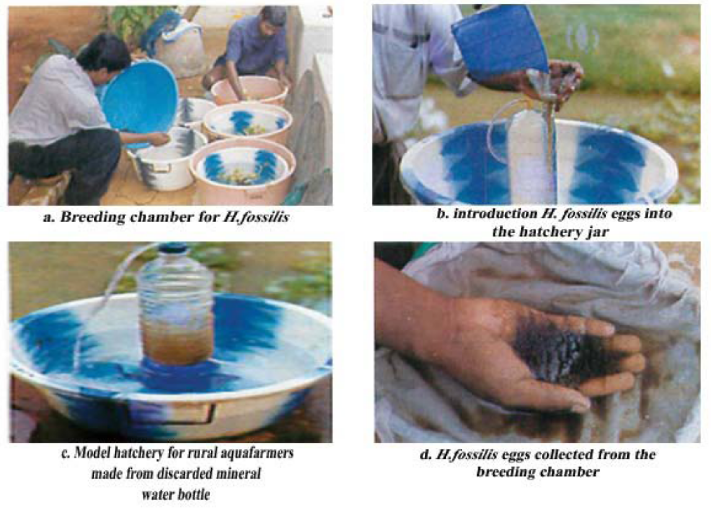 Low cost breeding and hatching techniques: Research team of CARE has succeeded in induced breeding of H.fossilis using cement aquaria with mud/sand beds. But the hatching rate was poor due to low oxygen level and high turbidity of water. Hence Vijaykumar et al. [9], fabricated low cost breeding and hatching devise for catfish farming. The breeding chamber contains a removable earthen tile to allow fish to hide and it was covered with a net to prevent them from jumping out during breeding. The hatchery consisted of a cylindrical glass tube (8 cm dia and 30 cm height) of 1 litre capacity (Figure 4 a,b). The tube had one opening at the bottom and two openings at the top, one for water outlet (5 mm dia) and the other to introduce eggs (15 mm dia). The inlet opening (5 mm dia) at the base of the glass tube was connected to a flexible tube (5mm dia) for water flow (Figure 4c).