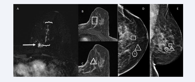 Figure 1: A: T1-weighted post-contrast subtraction MRI shows a lobular mass with irregular margins in the left breast upper inner quadrant (arrow). This finding is consistent with the index carcinoma. There is associated malignant appearing segmental, reticular non mass enhancement contiguous with the index mass extending anteriorly and laterally (brackets). B and C: Post-contrast MRI show clip marker placement in the anterior-superior (square) and lateral (triangle) most extent of enhancement. D and E: Craniocaudal and lateral post-clip mammography shows the index tumour (circle) and two ribbon clip markers delineating the anterior (triangle and square) and lateral (square) most extent of disease. Final pathology showed invasive and in situ ductal carcinoma with negative margins.