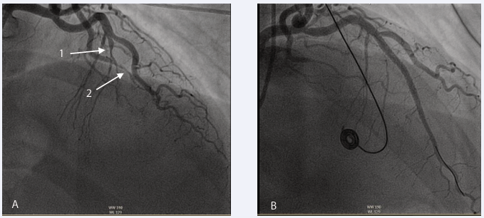 Figure 1: Coronary angiography from initial presentation in 2019. (A) Anteroposterior Cranial view. Arrow 1 highlights SCAD in mid part of left anterior descending after the first diagonal branch, arrow 2 demonstrates SCAD in distal marginal branch. (B) Right anterior oblique cranial view post PCI to mid left anterior descending (LAD) artery following deployment of 2 drug eluting stents (DES)