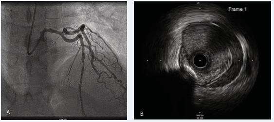 Figure 2: Following presentation in 2024. (A) Anterio posterior cranial imaging during coronary angiography demonstrated features in keeping with in-stent restenosis. (B) Intravascular Ultrasound (IVUS) confirmed haematoma in the proximal LAD.