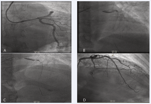 Figure 4: Return to cath lab. (A) Anterio posterior caudal view showed SCAD in LAD back to LMS with no flow in distal LAD. (B) Anterio posterior Cranial showed no flow in LAD (Dye hang up). (C) Wolverine cutting balloon 4.0x12 at 6 atm pressure was used to release the hematoma in LMS and Proximal LAD. (D) The result after PCI with 2 Drug eluting stents from LMS down to mid LAD.