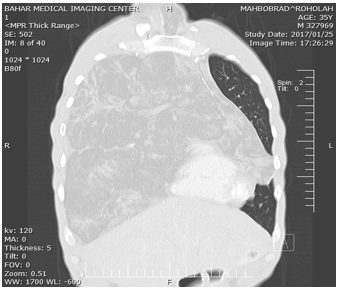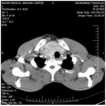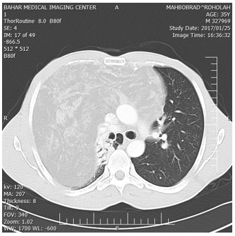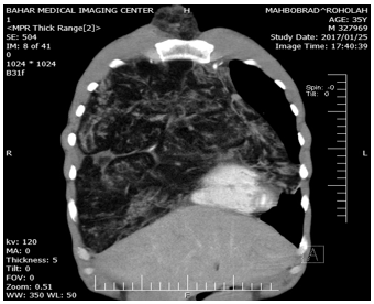 The patient is 30 year old man who has been struggling with progressive chest pain and productive cough, dyspnea and right side neck swelling for the last two years. The symptom has been increased by the last two month .In physical examination in right side of neck a soft tissue mass was palpable. The history of past medical, he had a sever car accident in two year ago and chest tube insetion in right hemithorax because of hemothorax and laparatomy. Breath sound in right hemithorax was absent. The heart biting was palpable in in five intercostal space in middle axilla line, others was normal. CXR, show completeopassification of right hemithrax. Pulmonary function tests showed a decrease in forced vital capacity (47% predicted) and forced expiratory volume (42% predicted) with a total lung capacity of only 72%. These findings were interpreted as being consistent with mixed obstructive and restrictive lung disease. During his diagnostic evaluation, a computed tomographic scan was performed, CT scan show a huge mass of anterior mediastinum and right hemithorax with extension to left hemithorax and neck,the mass was collapsed totally the right lung and shift mediastinum to the left side and compressed the heart. The Radiologist’s report was liposarcoma or teratoma (Figure 1-3).