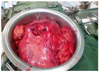 After tumor dissection and sectioning of the blood vessels, First right hemithorax and mediastinal masses wasresected completely. For prevention of re-expansion pulmonary edema, we did not re-expanded the right lung.Neck portion was resected via the mediastinum.Left side mediastinal and pleural portion was resected complexly. Weight of mass was 5000 g (Figure 5).