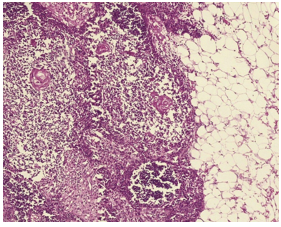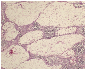 Figure 7: Mature adipose tissue admixed by normal thymus containing epithelial cells, thymic lymphocytes and Ha.