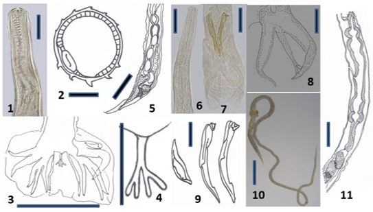 Figure 1: Ohbayashinemaochotoni (1 to 4) and Trichostrongylus retortaeformis (6 to 11) obtained fromOchotona curzoniae in Qinghai Province. 1 and 6: anterior extremity of male; 2:cross-section at mid-body of male; 3 and 7: ventral side of bursa; 4 and 8: dorsal ray; 9: spicules and gubernaculum; 10: whole body of female; 11: genital organ. Scale bars. 1, 3, 5, 7 and 11: 0.1 mm; 2: 0.01 mm; 4. 8 and 9: 0.05 mm; 6: 0.2 mm; 10: 0.5 mm.