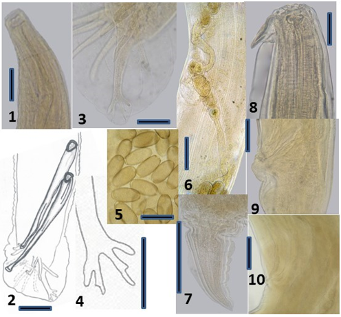 Figure 2: Gradiphiellaochotonae (1 to 7) and Cephaluris coloradensis (8 to 10) obtained from Ochotona curzoniae in Qinghai Province. 1 and 8: anterior extremity of male; 2: bursa and spicules; 3 and -4: dorsal ray; 5: eggs; 6: genital organ of female; 7: tail of female; 9: cloaca of male, 10: vulva. Scale bars. 1, 2, 5 and 6: 0.1 mm; 3, 4, 8, 9 and 10: 0.05 mm; 7: 0.5 mm.