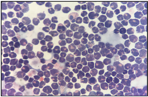 Chest ultrasonography revealed massive right sided pleural effusion of depth 9 mm, pleural thickening with underlying collapse. A pericardial effusion of 12 mm was also present. USG abdomen showed an enlargement in the liver size to 13 cm with no intra hepatic biliary radical dilatation or space occupying lesion. No splenomegaly was noted. Pancreas, kidneys, urinary bladder were also within normal limit. No free fluid was detected. No lymphadenopathy was detected. Thoracocentesis was performed. Pleural fluid was grossly straw colored and the routine biochemical examination showed a sugar content of 10mg/dl (low) and proteins 4200 mg/dl (normal). The total leukocyte count was 50x109 /L. The cytologic examination of the effusion smears revealed massive number of atypical lymphoid cells. These cells were predominantly small to intermediate in size, with a high nucleo cytoplasmic ratio, thin rim of cytoplasm. Nuclear chromatin was condensed with many of the cells showing indentations and clefting. Nucleoli were inconspicuous. Mitotic count was high ranged from 10 to 12 per 10 high power field (Figure 2).