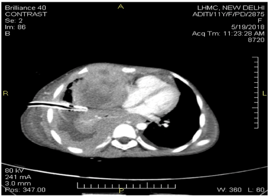 An 11-year-young female presented in the pediatric outpatient department of Kalawati Hospital, with fever, cough, weight loss, chest pain and shortness of breath for one month. The fever was low grade, intermittent and was relieved on medication. Cough was mildly productive. She complained of chest pain and shortness of breath that had progressively worsened in the past one week. General physical examination was within normal limit. No peripheral lymphadenopathy was seen. However, chest examination revealed significantly decreased breath sounds over the right hemi thorax with a dull percussion note. Liver was enlarged 2.5 cm below the costal margin, however there was no splenomegaly. Laboratory results included a complete blood count, liver function tests, kidney function test, Acid blood gas analysis (ABG). The leukocyte count was decreased to 2.37x 109 /L; hemoglobin was 13.9 g/dl (normal); platelet count, 302 x 109 /L (normal). A peripheral blood smear examination revealed leucopenia with no abnormal lymphoid cells. Serum creatinine, blood urea nitrogen, serum electrolytes, alanine aminotransferase (ALT), aspartate aminotransferase (AST), alkaline phosphatase (ALP) were all within normal limits. The ABG however revealed a decrease in the oxygen saturation to 60mmhg (normal 83-108), and a decrease in the carbon dioxide saturation to 26mmhg (normal 32-45). Serum test results were negative for hepatitis B virus (HBV), human immunodeficiency virus (HIV). Sputum cultures were negative for bacteria, fungus, and Mycobacterium tuberculosis.