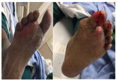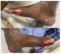 A 59-year-old male with a history of chronic systolic heart failure, mitral valve repair, hypertension, chronic kidney disease stage III, atrial flutter, gout, and alcohol abuse who had presented to our hospital with new bullous lesions on both of his hands and both of his feet for two days before admission. He said that blisters on his feet appeared first which then ruptured (Figure 1,2)