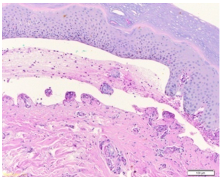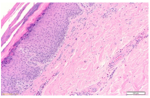 Figure 4: Punch biopsy of skin with epidermis showing hyperkeratosis and minimal spongiosis. In the superficial dermis, there is a mild mixed perivascular infiltrate. (Hematoxylin & Eosin stain, magnification 100X).