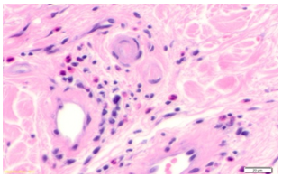 Figure 5: Dermal mixed superficial perivascular composed of neutrophils, eosinophils, and lymphocytes are seen. A fibrin thrombus is seen. Nuclear dust is also seen. Other features characteristic for leukocytoclastic vasculitis (e.g., fibrinoid vascular necrosis or extravasated red blood cells are not prominent. (Hematoxylin & Eosin stain, magnification 400X).