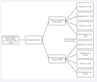 Results: CINtec PLUS was positive in 63 out of 312(20%) NILM/ HPV-positive cases. The positive predictive value (PPV) of CINtec PLUS was 92% for High-Grade Dysplastic Lesion (HSIL), 64% for NILM and 31% for low grade dysplasia. The negative predictive value was 83% for HSIL, 64% for NILM and 83% for low grade dysplasia.
