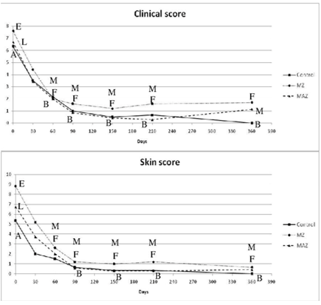 Figure 1: Clinical Score and Skin score in the three treatment groups at DO and in each follow-up (D30, D60, D90, D150, D210, and D360).Different letters in the same experimental group show statistical differences: Control group (MA): A, B = p < 0.01; MZ group: E, F = p < 0.01; MAZ group: L, M = p< 0.01.