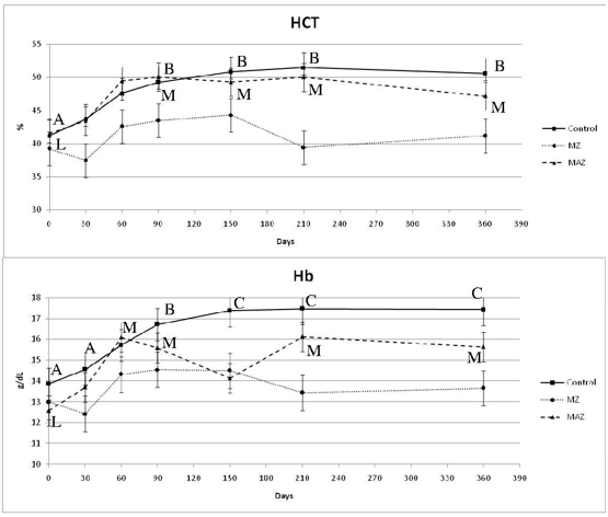 Figure 2: HCT (as %) and Hb (as g/dl) values registered in the three treatment groups at DO and in each follow-up (D30, D60, D90, D150, D210, and D360).Different letters in the same experimental group show statistical differences: Control group (MA): A, B, C = p < 0.01; MAZ group: L, M = p < 0.01.