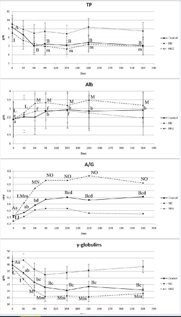 MA group at D0 showed TP values higher from D60 up to D 360 (p < 0.01). In MAZ group, the TP at D0 were higher than D90 up to D360 (p < 0.05). No differences for TP were observed during the trial in MZ group (p > 0.05). Albumin values of MA group from D90 up to D360 were higher than D0 (p < 0.05). Moreover, in MZ group Alb showed higher values than D0 from D60 up to D150 (p < 0.05). In MAZ group Alb values increased from D60 up to D360 if compared to D0 and D30 (p < 0.01). In MA group the A/G ratio at D60 (p < 0.05) and D150 (p < 0.01) showed higher values than D0. In MAZ group, at D30 (p < 0.05), at D60 (p < 0.01) and from D90 up to D360 (p < 0.01) the A/G ratio was higher than D0 (p < 0.01). No significant differences were observed in the A/G ratio of MZ group (p > 0.05). In MA group, γ-globulin levels from D90 up to D360 were lower than D0 (p < 0.01) and yet at D60 were lower than D0 (p < 0.05). In MAZ group, the γ-globulin levels from D60 up to D360 were lower than D0 (p < 0.01). No significant differences were observed in the MZ group about γ-globulin (p > 0.05).