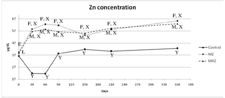 Figure 4: Zinc serum concentration at DO and in each follow-up (D30, D60, D90, D150, D210, and 360) in the three treatment groups. Different letters in the same experimental group show statistical differences: Control group (MA): p > 0.05; MZ: E, F = p < 0.01; MAZ: L, M = p < 0.01. Different letters in the same experimental days showed statistical differences between the groups (X, Y: p < 0.01).