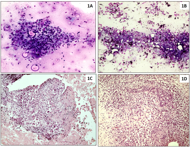 Figure 1: 1A: Microphotograph of FNA smear showing epithelioid cell granuloma along with lymphocytes (Giemsa, 200x), 1B: Epithelioid cell granulomas in acute inflammatory background (Giemsa, 100x). 1C: Histological section showing granulomas and caseous necrosis (H&E, 100x) 1D: Trucut biopsy showing epithelioid cell granuloma along with Langhans type giant cell and benign breast ductal cells. (H&E, 200x).