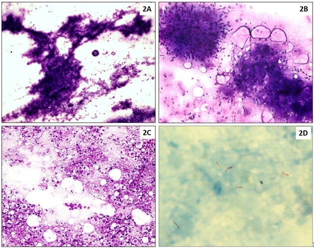 Figure 2: 2A: Microphotograph showing abundant caseous necrosis (Giemsa, 40x); 2B: multiple epithelioid cell granulomas along with caseous necrosis (Giemsa, 400x); 2C: Benign ductal cells along with histiocytes in a suppurative background (Giemsa, 100x); 2D: Acid fast bacilli seen on ZN staining. (1000x).