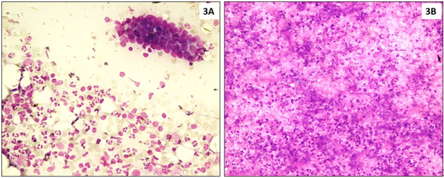 Figure 3: 3A: Cluster of benign ductal epithelial cells in an acute inflammatory background (Giemsa, 200x). 3B: Intense suppurative background (Giemsa, 100x).