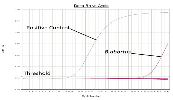 Figure 2: Positive result of B. abortrus from extracted bacterial DNA of cattle blood clot. CT Value =34.81 and 36.94.