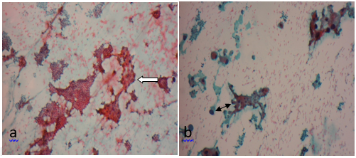 b) Discret and cluster of follicular cells (black arrow). Papanicolau stain x100.