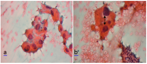 The smears were stained with Papanicolau stain. They appearedmoderately cellular; discrete as well as clusters of thyroid follicular cells exhibiting anisokaryosis with moderate hyperchromatism were seen (Figure 1 a,b).