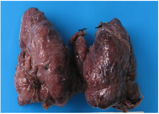 The specimen consisted of a butter-fly shaped thyroid, measuring 8.0 x 6.3 x 2.0 cm, weighing 49 grams (Figure 3).