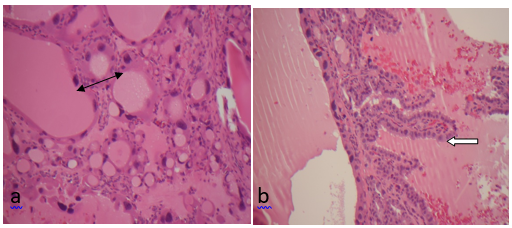 Figure 4: a) various size and shape follicles lined by large cuboidal to columnar Cells with bright eosinophilic cytoplasm. Their nuclei manifested anisokaryosis, hyperchromatism, pleomorphism, and increased N/C ratio (black arrow). H & E stain X200.